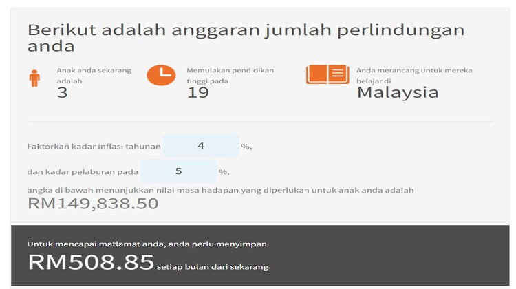 Anda boleh gunakan kalkulator pendidikan ini untuk mengira jumlah perlindungan yang diperlukan dan berapa amaun simpanan bulanan perlu dikeluarkan bagi tabung pendidikan.