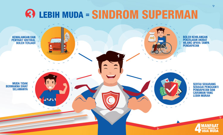 Ketika anda muda, anda fikir bahawa anda imun terhadap segala sesuatu; juga dikenali sebagai Sindrom Superman. Tetapi anda jangan lupa; kemalangan berlaku, penyakit juga boleh menimpa anda. Apabila perkara ini memberi kesan kepada anda, kadar caruman Takaful akan meningkat. Sekiranya keadaan anda teruk, anda mungkin perlu membayar caruman yang lebih tinggi atau keadaan sedia ada anda akan dikecualikan apabila anda memohon perlindungan. Pada ketika ini, pilihan perlindungan Takaful anda terhad dan anda mungkin tidak mendapat perlindungan yang sangat anda perlukan. Lebih teruk lagi sekiranya kemalangan atau penyakit itu menjadikan anda hilang upaya kekal, seterusnya menyebabkan anda kehilangan pekerjaan.Tetapi, jika anda telah pun memiliki perlindungan takaful. Anda sudah tidak perlu risau lagi tentang perkara sebegini. Inilah antara kelebihan takaful yang dapat dinikmati jika anda memilikinya pada usia muda