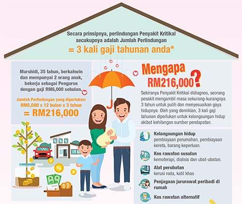 Peraturan asas untuk memastikan jumlah perlindungan penyakit kritikal yang mencukupi adalah 3x daripada gaji tahunan anda. Mengapa 3 kali? Sekiranya didiagnos dengan penyakit kritikal, anda memerlukan sekurang-kurangnya 3 tahun untuk menyesuaikan gaya hidup anda sehingga anda pulih.