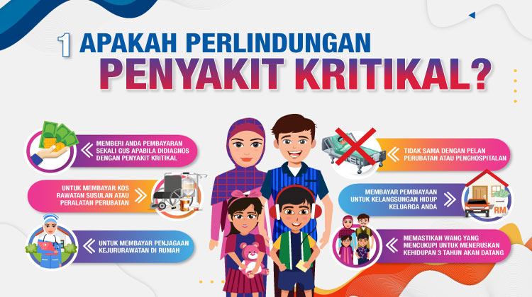 Tujuan utama pelan perlindungan penyakit kritikal adalah untuk memberi pampasan kepada anda dan keluarga apabila didiagnos dengan penyakit kritikal, tanpa mengira kos rawatan di hospital. Pelan perlindungan penyakit kritikal tidak seperti pelan perlindungan kesihatan biasa. Ia diselaraskan untuk membantu anda membayar apa sahaja yang anda pilih, agar dapat membantu proses pemulihan dan penyesuaian hidup anda sekiranya penyakit yang mengancam nyawa menyerang anda. Tidak mudah untuk membayangkan jika didiagnosis dengan penyakit kritikal, tetapi ia adalah realiti bagi kebanyakan kita rakyat Malaysia pada suatu ketika dalam kehidupan kita. Pelan perlindungan penyakit kritikal adalah salah satu cara untuk mengurangkan tekanan dan beban kewangan yang dialami oleh anda dan orang tersayang dan memastikan anda lebih bersedia untuk memenuhi keperluan kehidupan.