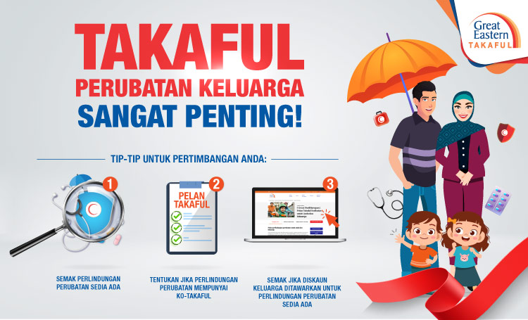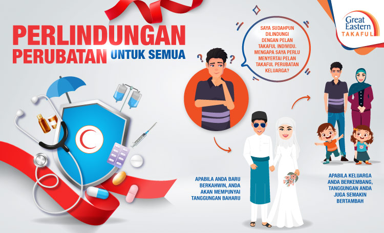 Apabila anda baru berkahwin, anda akan mempunyai tanggungan baharu danapabila keluarga anda semakin berkembang, tanggungan anda juga semakin bertambah. Sememangnya, anda ingin memastikan sumber kewangan anda mencukupi untuk menampung kehidupan keluarga anda dalam menghadapi apa jua musibah yang akan berlaku kepada mereka mahupun anda sendiri. Dengan menyertai Takaful perubatan keluarga, ia membolehkan anda sekeluarga mendapat perlindungan perubatan yang mencukupi. Melalui cara ini, anda akan menjadi lebih yakin bahawa pasangan dan anak-anak anda sentiasa dilindungi ketika sakit dan/atau menghadapi kecemasan perubatan.