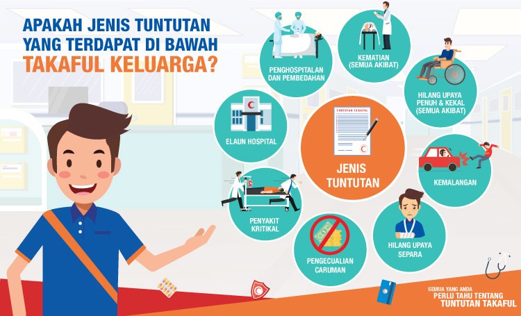 Terdapat pelbagai jenis tuntutan yang anda boleh mohon. Ilustrasi di atas adalah jenis-jenis tuntutan yang lazim dimohon di bawah Takaful Keluarga, termasuk tetapi tidak terhad. Sila maklum bahawa setiap jenis tuntutan berbeza berdasarkan pelan perlindungan yang anda sertai.