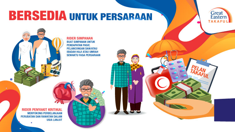 Dalam perjalanan hidup anda di kemudian hari, anda juga mungkin menginginkan persaraan yang tenang. Bagi persediaan persaraan sewaktu berusia 40-an, perlindungan Takaful anda juga seharusnya dilengkapi dengan pelan Takaful persaraan, bagi memastikan anda bebas hutang, telah mengumpul harta yang cukup bagi keluarga anda, dan menikmati persaraan yang selesa. Rider berikutnya, walaupun telah dihuraikan di atas, ada fungsi yang lain bagi fasa penyediaan persaraan.