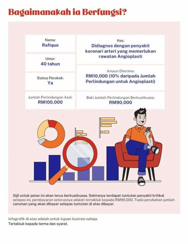 Apabila berlakunya salah satu daripada 50 Penyakit Kritikal ke atas Orang Yang Dilindungi, kami akan membayar jumlah perlindungan dari Dana Tabarru’ dengan jumlah penuh, kecuali bagi angioplasti dan rawatan invasif lain untuk penyakit arteri koronari, yang mana pembayaran tuntutan adalah terhad kepada 10% daripada jumlah perlindungan tertakluk kepada jumlah maksimum RM25,000.