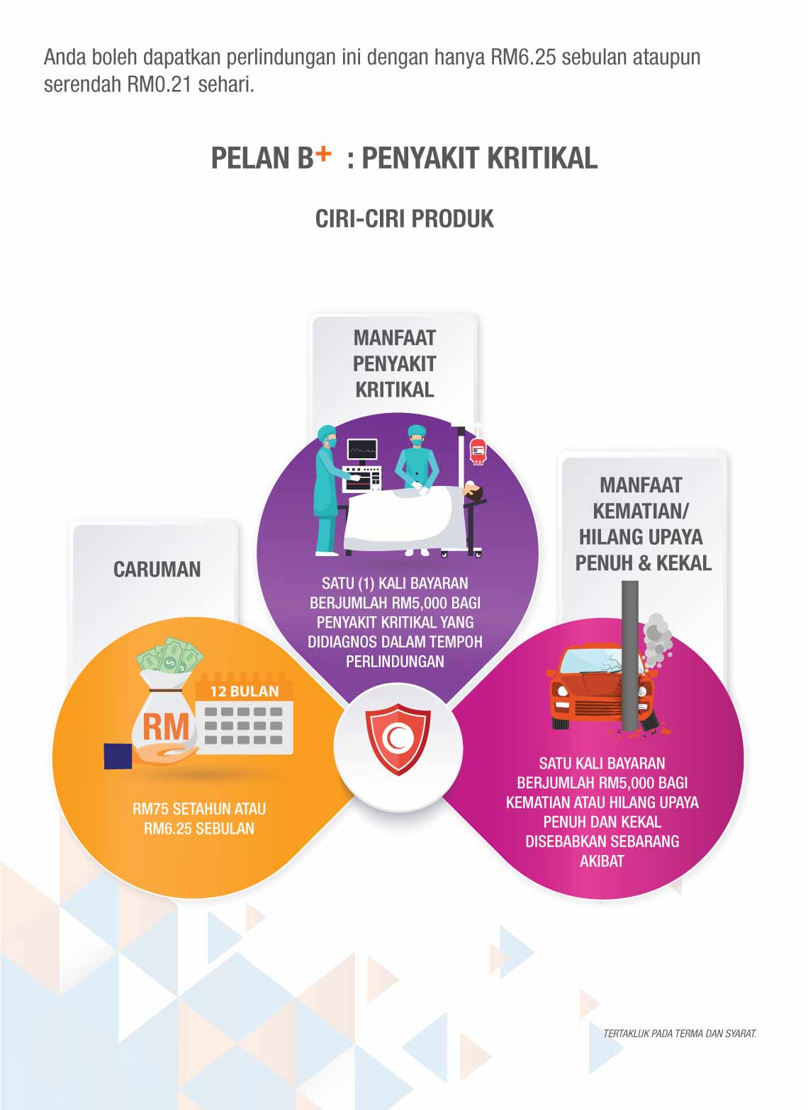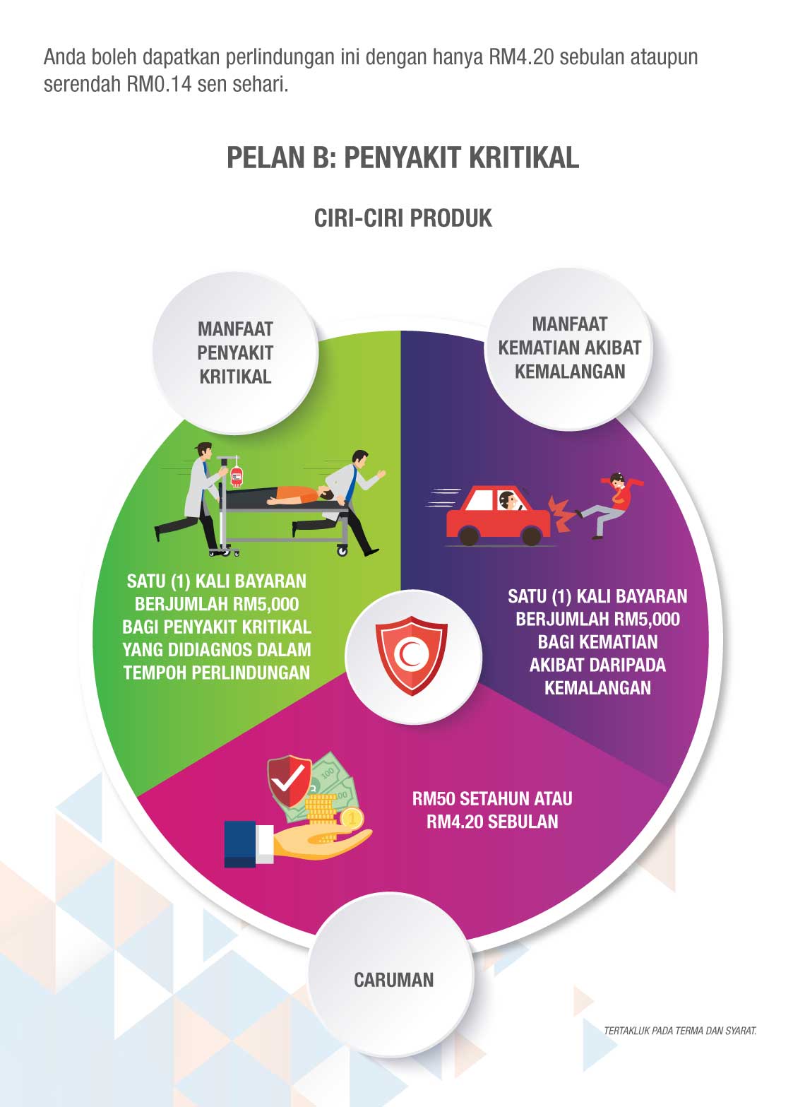 Orang Yang Dilindungi layak menerima pembayaran sekali gus berjumlah RM5,000 sekiranya didiagnos dengan penyakit kritikal dalam tempoh perlindungan.