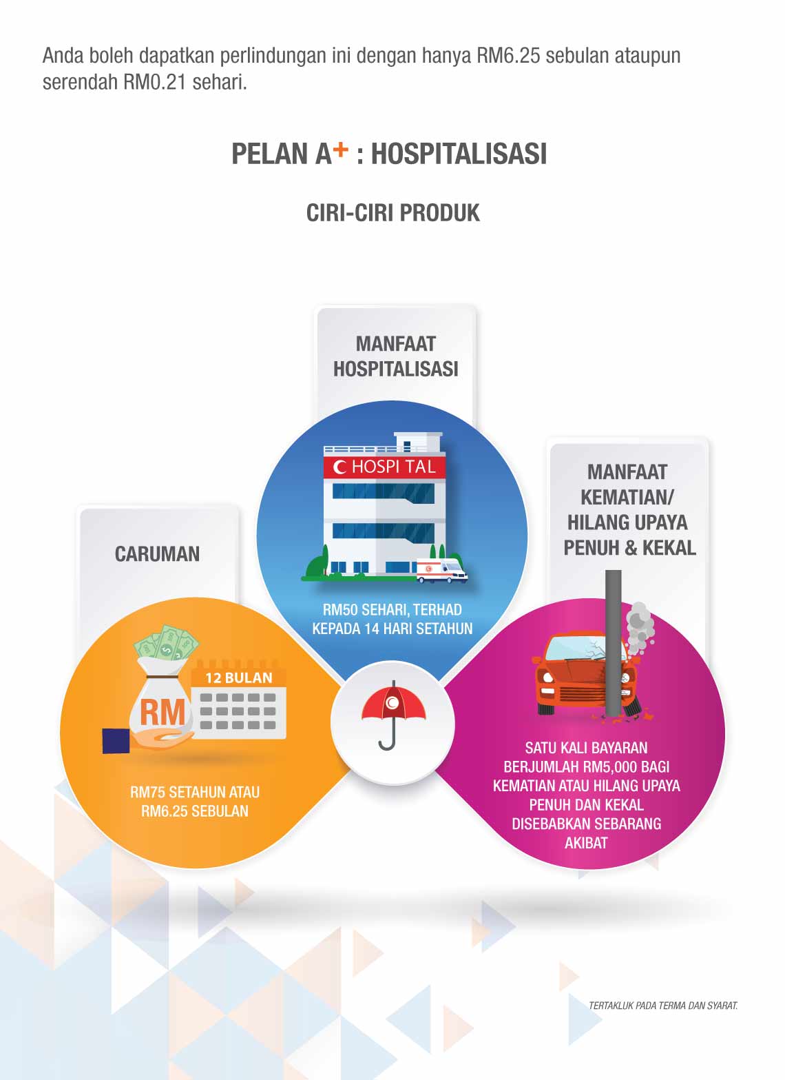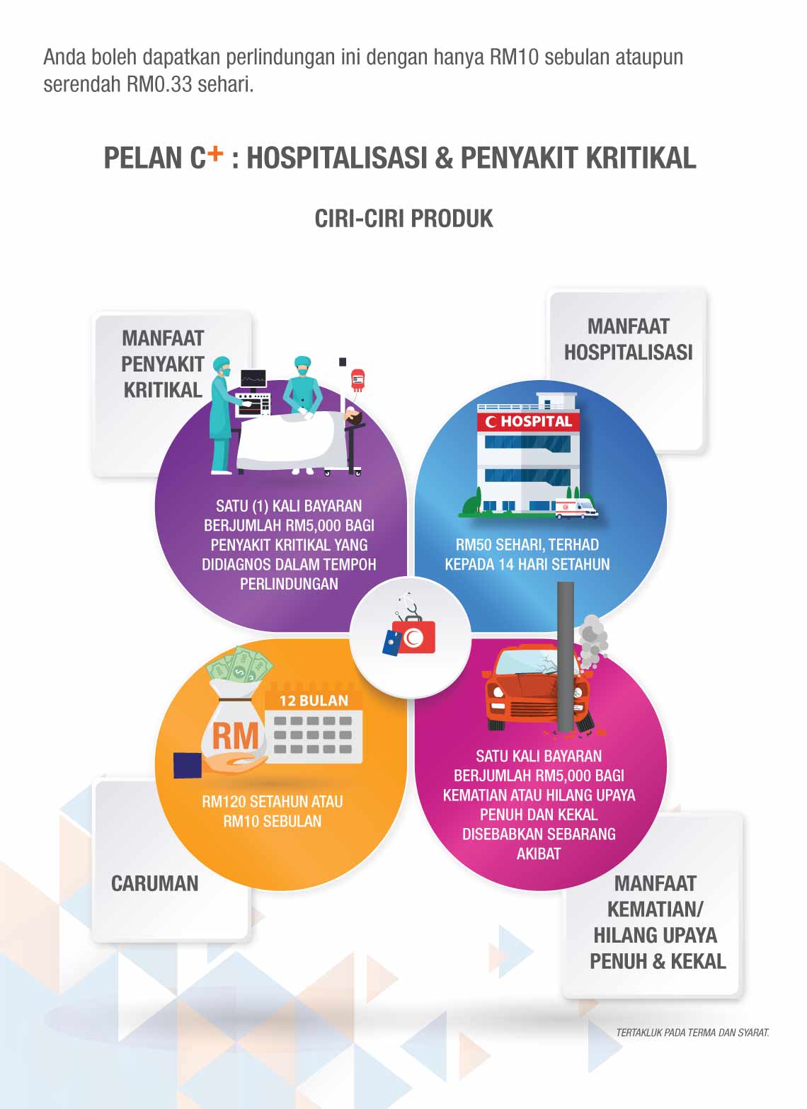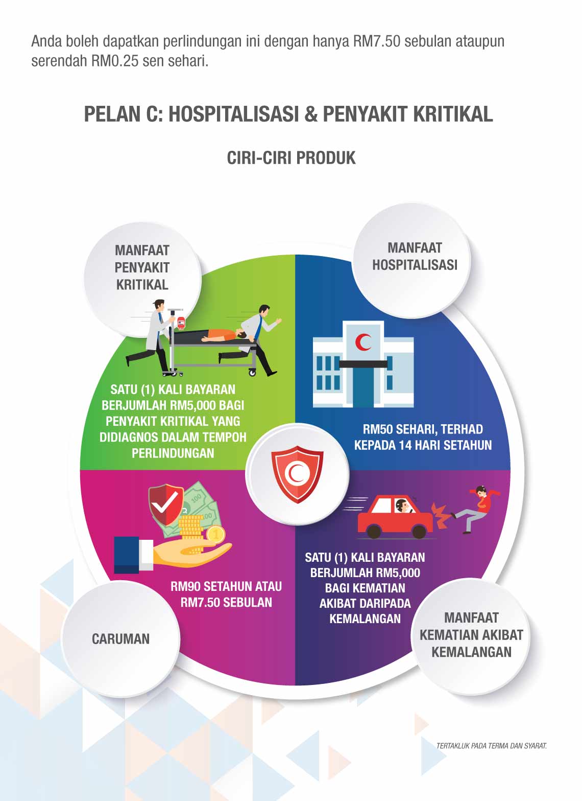 Maklumat ini adalah untuk maklumat am sahaja dan bukanlah satu kontrak Takaful Berkelompok. Anda dinasihatkan untuk merujuk kepada Risalah Pemberitahuan Produk dan contoh Sijil bagi mendapatkan maklumat terperinci berkenaan ciri penting dan manfaat pelan sebelum menyertai pelan ini. Anda juga boleh merujuk kepada risalah pendidikan pengguna mengenai Takaful Perubatan & Kesihatan yang dikeluarkan di bawah Program Pendidikan Pengguna untuk maklumat lanjut.
