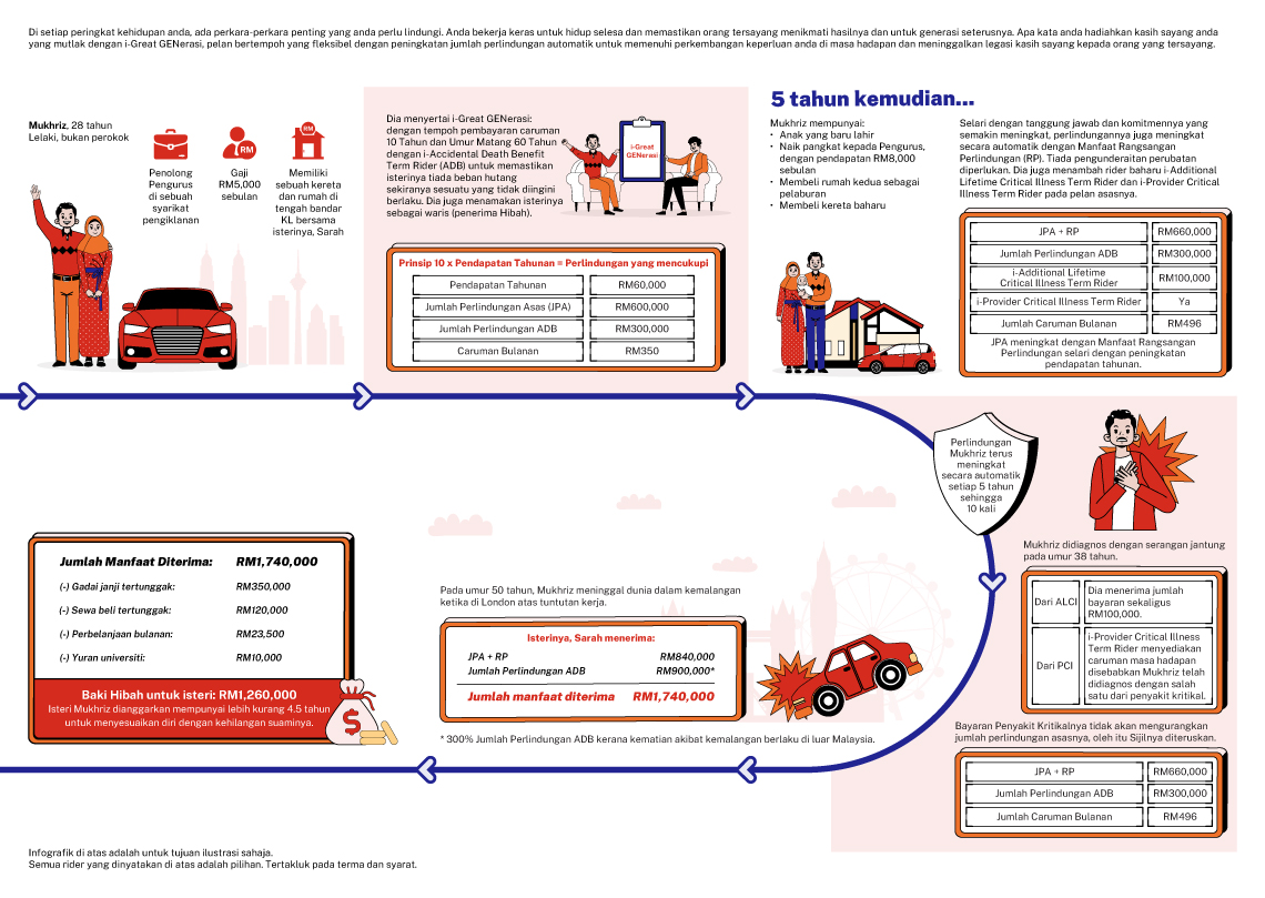 Maklumat ini hanyalah untuk maklumat am sahaja dan bukanlah satu kontrak Takaful Keluarga. Anda dinasihatkan untuk merujuk Ilustrasi Manfaat, Risalah Pemberitahuan Produk dan contoh Sijil bagi mendapatkan maklumat terperinci berkenaan ciri penting dan manfaat pelan sebelum menyertai pelan ini.