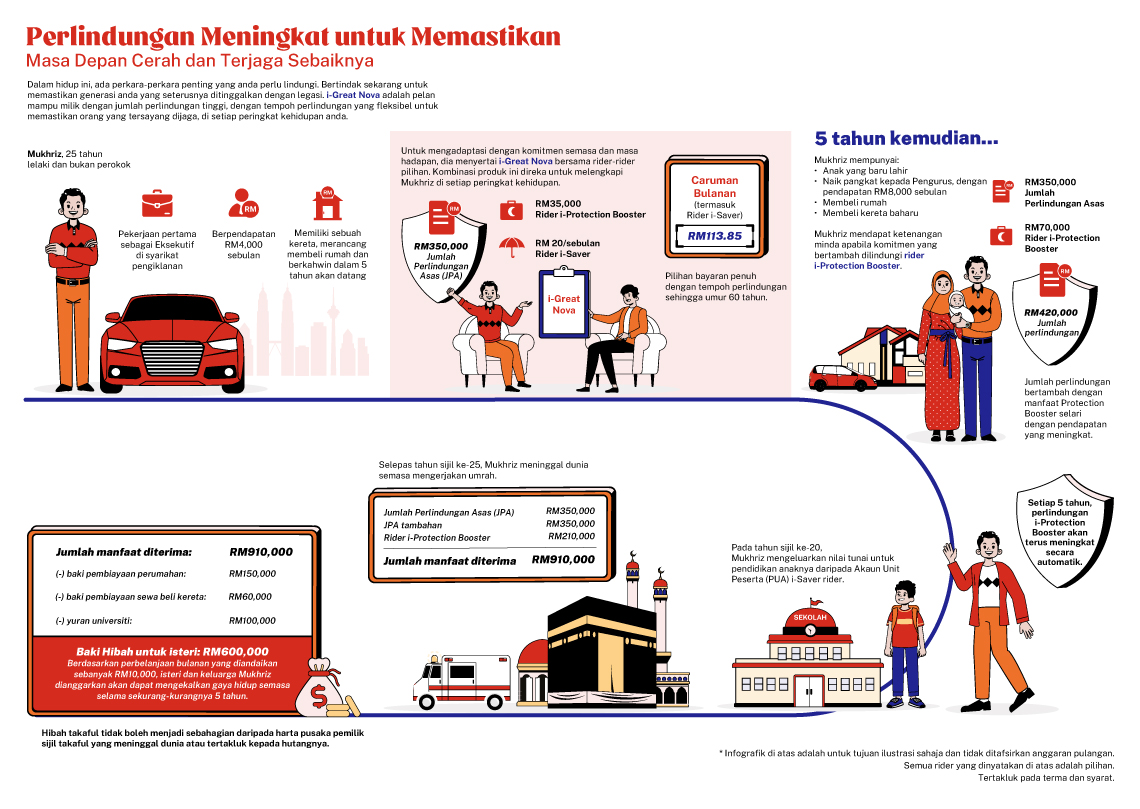 Maklumat ini hanyalah untuk maklumat am sahaja dan bukanlah satu kontrak Takaful Keluarga. Anda dinasihatkan untuk merujuk Ilustrasi Manfaat, Risalah Pemberitahuan Produk dan contoh Sijil bagi mendapatkan maklumat terperinci berkenaan ciri penting dan manfaat pelan sebelum menyertai pelan ini.
