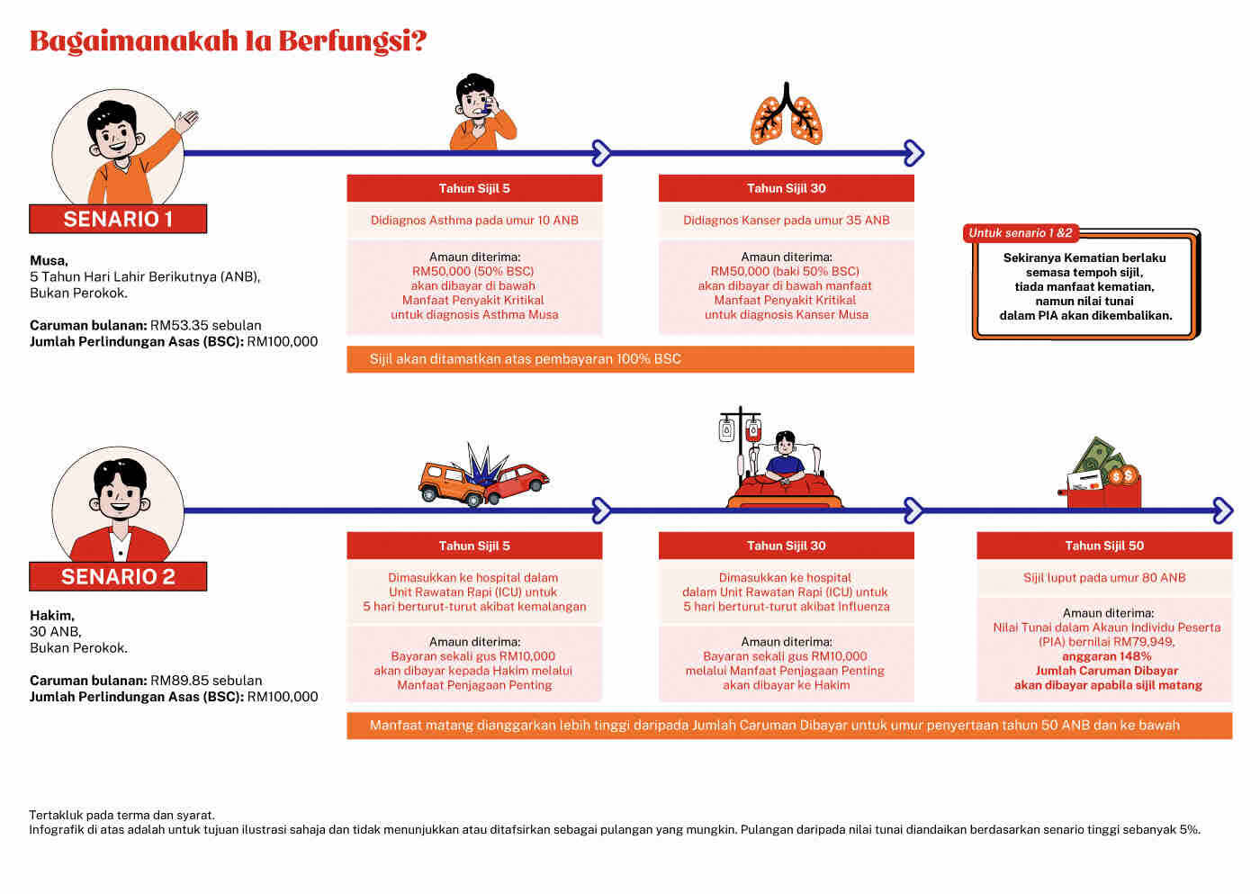 Risalah ini adalah untuk maklumat am sahaja dan bukanlah satu kontrak takaful keluarga. Anda dinasihatkan untuk merujuk Ilustrasi Manfaat, Risalah Pemberitahuan Produk dan contoh Sijil bagi mendapatkan maklumat terperinci berkenaan ciri penting dan manfaat pelan sebelum menyertai pelan ini.