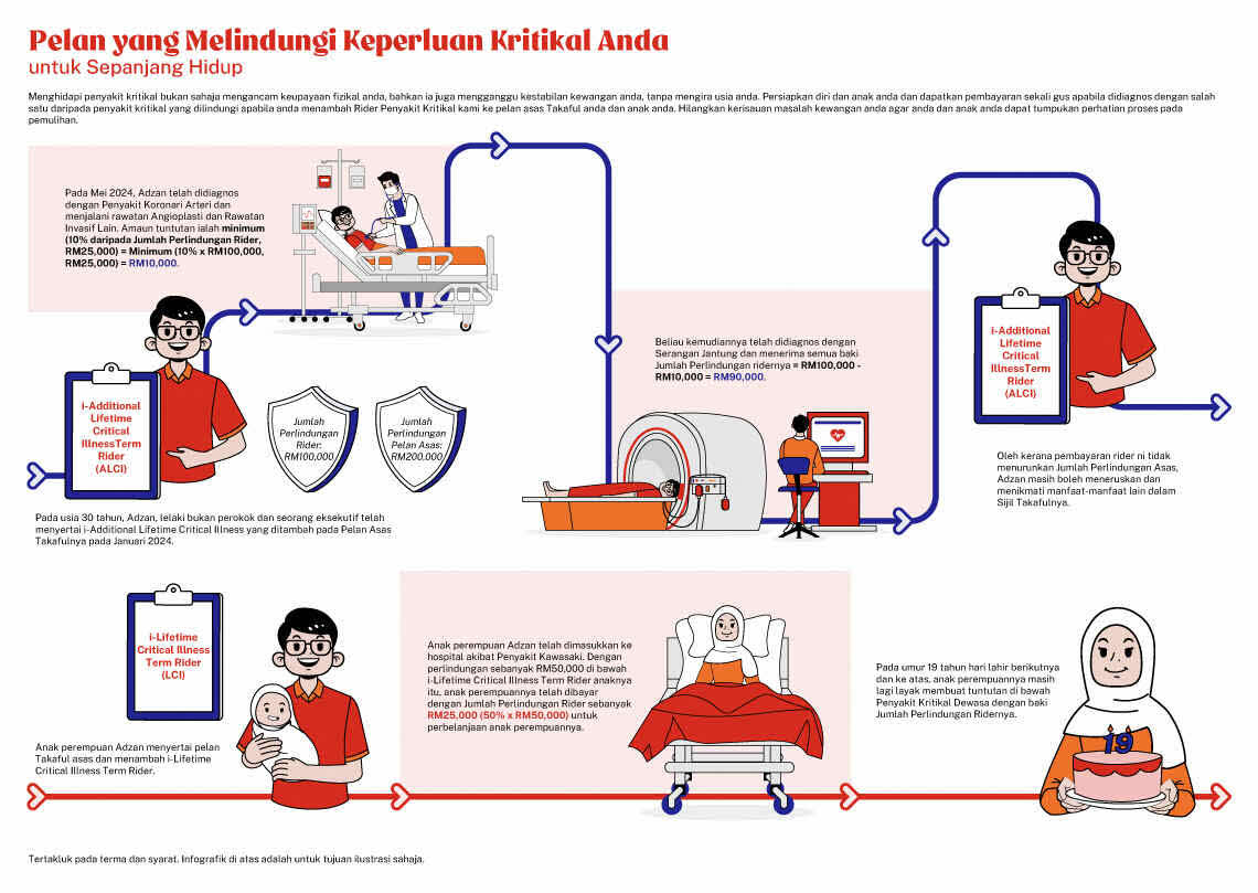 i-Additional Lifetime Critical Illness Term Rider dan i-Lifetime Critical Illness Term Rider adalah rider Takaful Perubatan dan Kesihatan dengan pembayaran caruman yang ditambahkan pada pelan perlindungan Takaful Keluarga bertempoh dengan caruman berkala yang terpilih yang menyediakan perlindungan bagi penyakit kritikal.