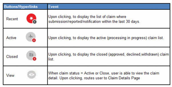 There will be three buttons under the claims overview which are Recent, Active and Closed. Refer the details as follows: