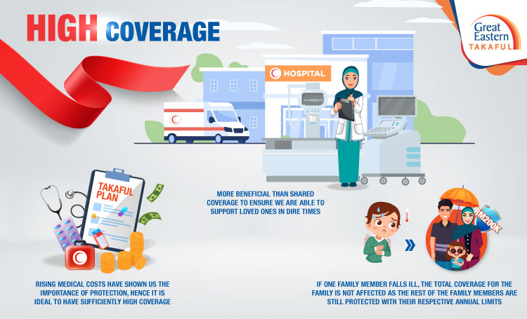 Rising medical costs have shown us the importance of protection, hence it is ideal to have sufficiently high coverage. When each family member enrols in a family medical Takaful, the annual limit is not shared. That means if one family member falls ill, the total coverage for the family is not affected as the rest of the family members are still protected with their respective annual limits.