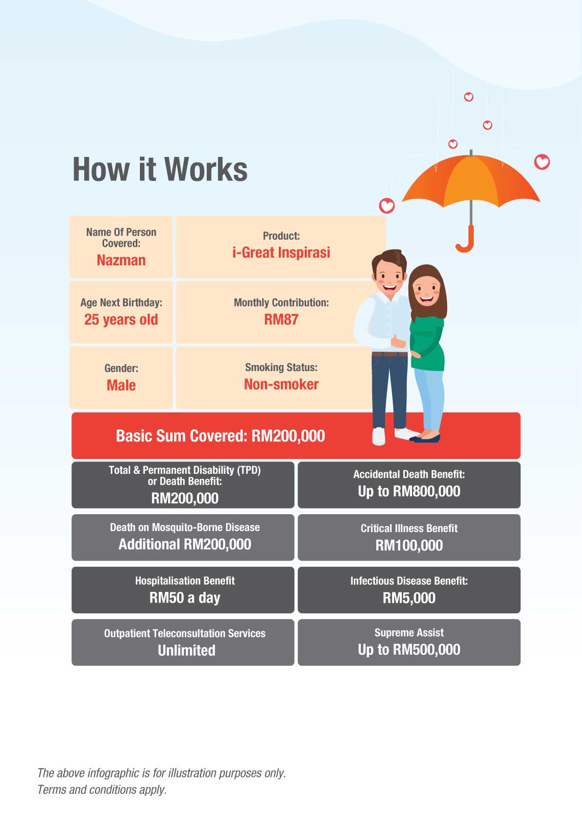 This information merely provides general information only and is not a contract of Family Takaful. You are advised to refer to the Benefit Illustration, Product Disclosure Sheet and sample Certificate for detailed features and benefits of the plan before participating in the plan.