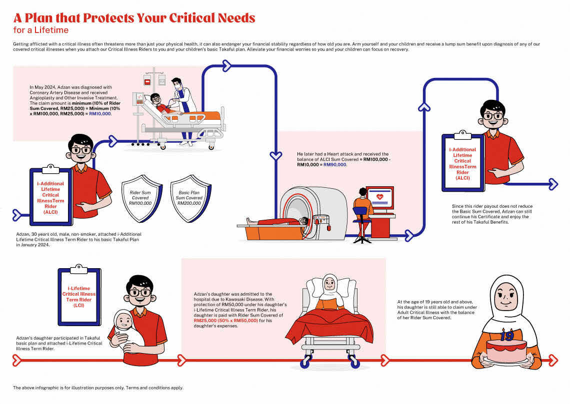 Terms and conditions apply. The info above merely provides general information only and is not a contract of family takaful. You are advised to refer to the benefit illustration, Product Disclosure Sheet and sample certificate for detailed features and benefits of the plan before participating in the plan. You may also refer to the consumer education booklet on Medical & Health Takaful issued under the Consumer Education Programme for more information.