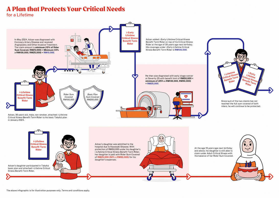 Terms and conditions apply. The info above merely provides general information only and is not a contract of family takaful. You are advised to refer to the benefit illustration, Product Disclosure Sheet and sample certificate for detailed features and benefits of the plan before participating in the plan. You may also refer to the consumer education booklet on Medical & Health Takaful issued under the Consumer Education Programme for more information.