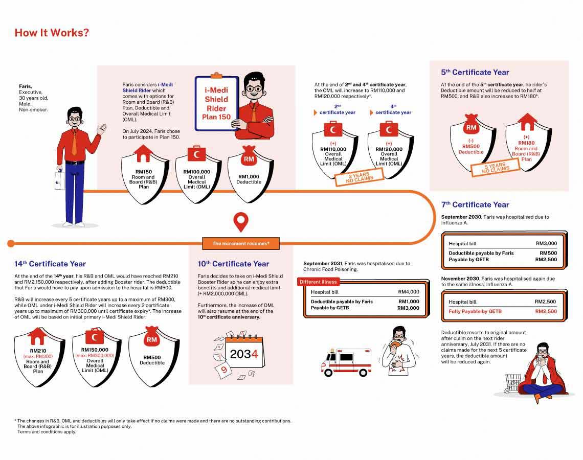 Choose from deductible of RM500, RM1,000, RM2,000 and RM5,000, with 50% reduction of chosen deductible amount*, subject to continuation of certificate, up-to-date contribution and no claims of at least 5 years.